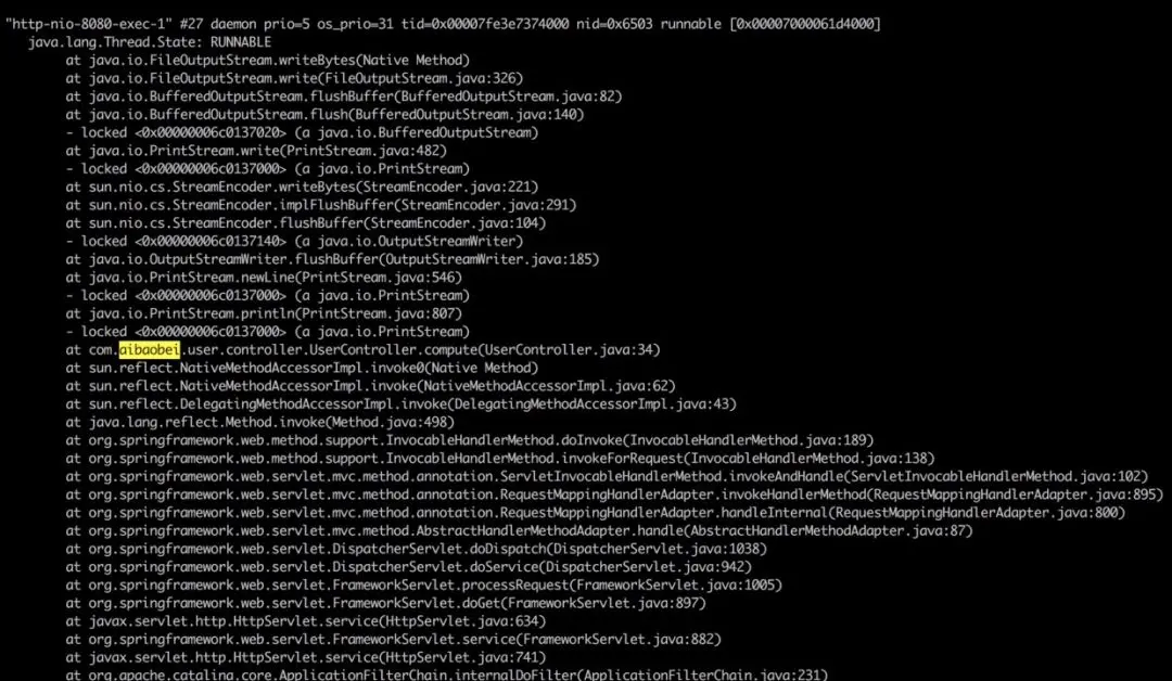 我们可以根据堆栈信息,直接定位到UserController的34行,查看代码中具体是什么原因导致计算量如此之高。