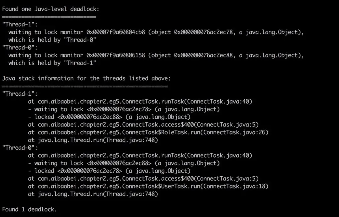 对于死锁,这种情况基本上很容易发现,因为 jstack可以帮助我们检查死锁,并且在日志中打印具体的死锁线程信息。如下是一个产生死锁的一个 jstack日志示例: