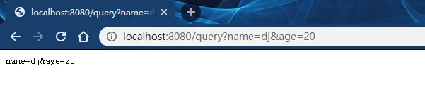 如果我们以localhost:8080/query?name=dj&age=20请求,查询字符串name=dj&age=20会原样传回客户端。但是RawQuery是字符串类型的,使用字符串方法解析也能用,但是太麻烦了!!!