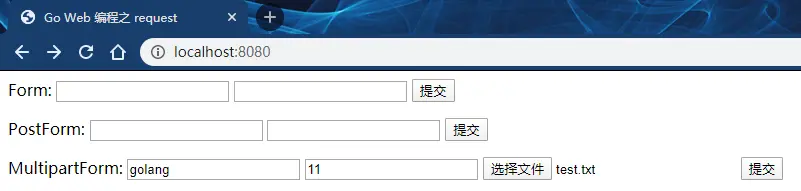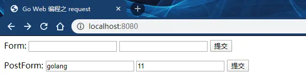 使用PostForm只会返回表单数据,不包括 URL 键值。如果把上面的程序中,r.Form改为r.PostForm,那么程序将显示以下结果: