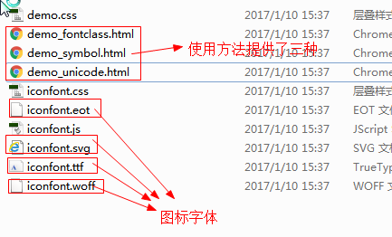2、将需要的四个图标字体的文件复制到对应的文件夹中,按照使用自定义字体的方式:先声明再使用。