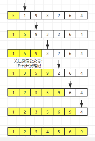 将数组中的数据分为已排序区间和未排序区间。初始已排序区间只有一个元素(数组第一个元素),取未排序区间中的元素,在已排序区间中找到合适的插入位置将其插入,并保证已排序区间数据一直有序。重复这个过程直到未排序区间中元素为空。