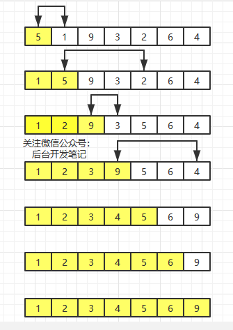 选择排序将数组分为 已排序区间 和 未排序区间,每次会从未排序区间中找到最小的元素,将其放到已排序区间的末尾。