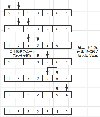 冒泡排序特点就是只会操作相邻的两个数据。每次冒泡操作都会对相邻两元素进行比较,若不满足条件就让它俩互换。一次冒泡(让当前未排序数组中最大/最小的值沉底/冒泡,时间复杂度为O(n))会让至少一个元素移动到它应该在的位置。重复 n 次就完成了 n 个数据的排序工作,总时间复杂度为O(n^2)