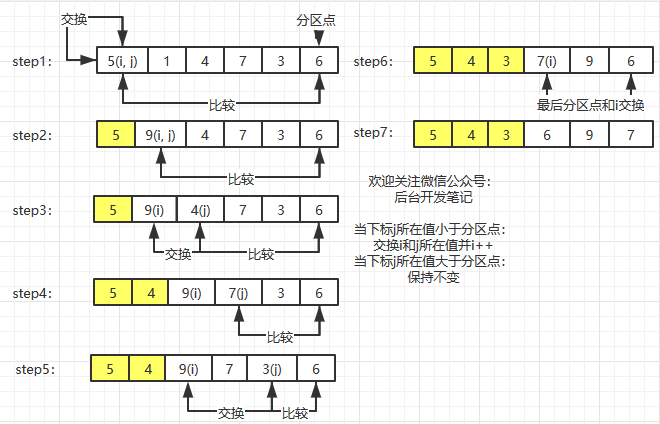 其核心原理就是设置标记点i代表[p, i - 1]的数据都小于分区点,[i,r - 1]的数据要么大于等于分区点,要么还未进行比较。