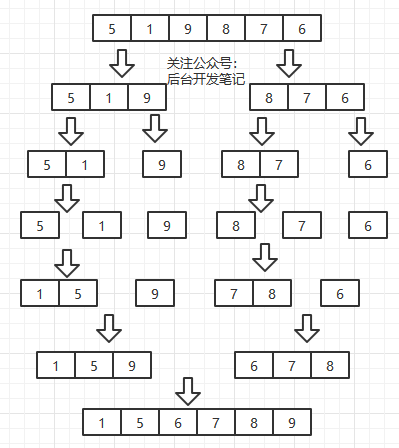 归并排序就是把数组下角标p~r从中间分成前后两部分,然后对前后两部分分别排序,再将排好序的两部分合并在一起,递归这个过程直到p >= r