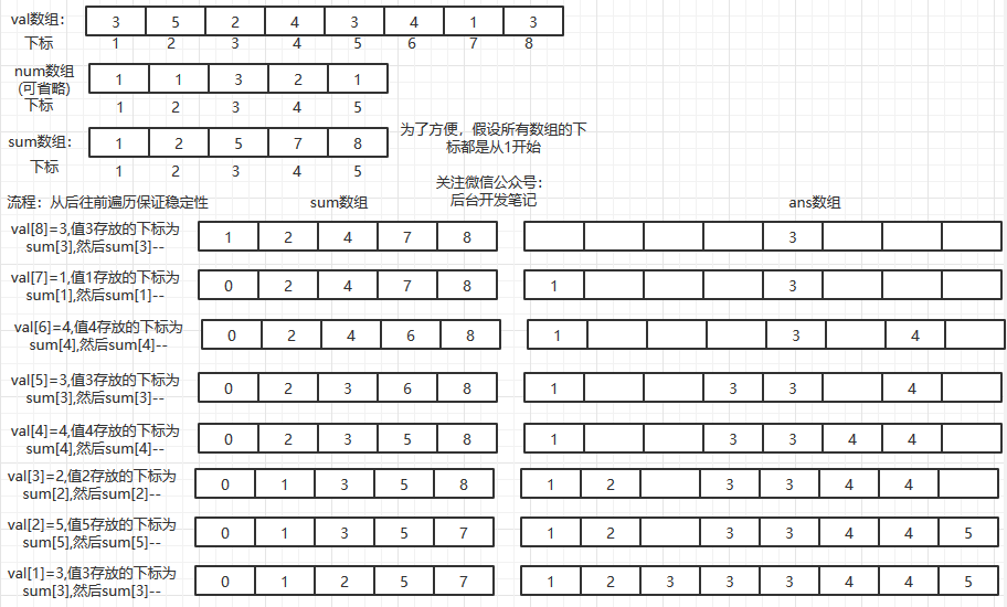 我们利用sum数组来累加每个有序桶的前缀和,来达到桶排序的目的: