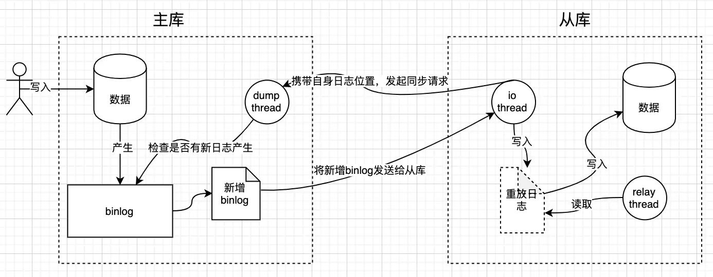 - 5、从库重放线程读取重放日志,将数据写入从库。