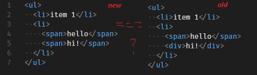 首先,需要编写一个函数来比较两个节点(旧节点和新节点),并告诉节点是否真的发生了变化。还有需要考虑这个节点可以是元素或是文本节点: