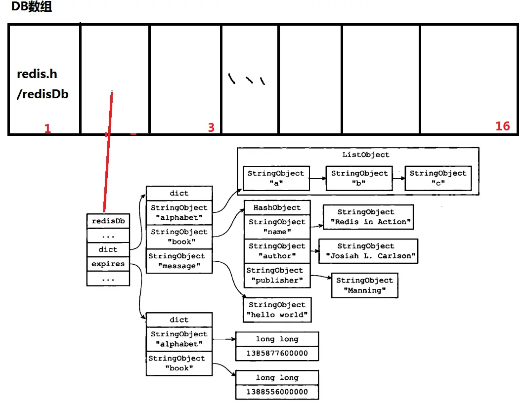 redis的数据库就是一个对象redisDb,redis服务器对象redisServer内部会持有一个redisDb数组,初始的时候数组大小为16,即redis数据库最开始有16个,客户端存放的数据就在这16个中的一个。