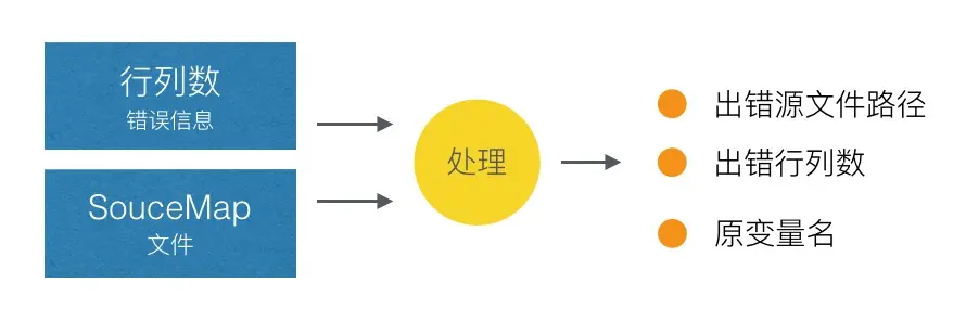 在定位压缩代码的报错时,可以通过错误信息的行列数与对应的 SourceMap 文件,处理后得到源文件的具体错误信息。