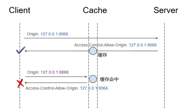 上图中,第一个请求(Origin: 127.0.0.1:8066)响应被浏览器缓存了,当第二个请求(Origin: 127.0.0.1:8888)发起,被错误命中了前一个请求的缓存,收到了 Access-Control-Allow-Origin: 的响应时,将导致资源加载失败。