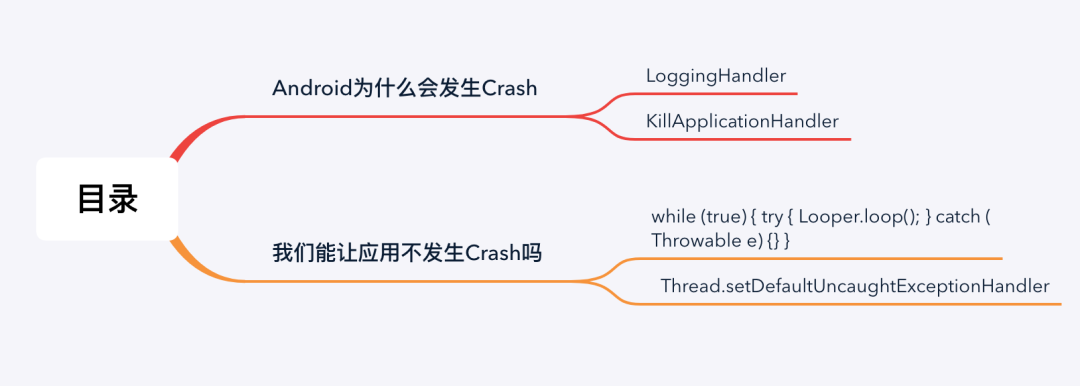 原理很简单,就是通过Handler往主线程的MessageQueue中添加一个Runnable,当主线程执行到该Runnable时,会进入我们的while死循环,如果while内部是空的就会导致代码卡在这里,最终导致ANR,但我们在while死循环中又调用了Looper.loop(),这就导致主线程又开始不断的读取queue中的Message并执行,这样就可以保证以后主线程的所有异常都会从我们手动调用的Looper.loop()处抛出,一旦抛出就会被try{}catch捕获,这样主线程就不会crash了,如果没有这个while的话那么主线程下次抛出异常时我们就又捕获不到了,这样App就又crash了,所以我们要通过while让每次crash发生后都再次进入消息循环,while的作用仅限于每次主线程抛出异常后迫使主线程再次进入消息循环