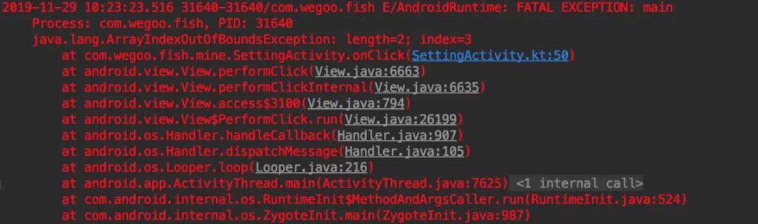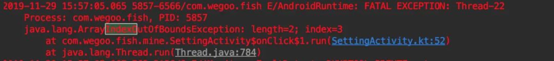 我在App中模拟了一个数组越界异常,Android系统会帮我们打印异常日志