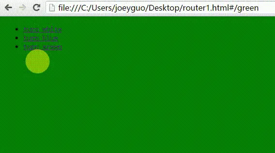 Router 调用方式以及呈现效果如下:点击触发 url 的 hash 改变,并对应地更新内容(这里为 body 背景色) < ul > < li >< a href = "#/" >turn white</ a ></ li > < li >< a href = "#/blue" >turn blue</ a ></ li > < li >< a href = "#/green" >turn green</ a ></ li > </ ul >