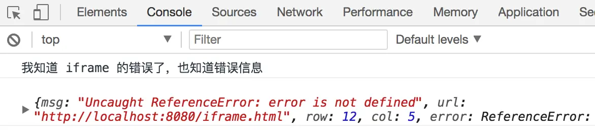 > window.frames[0].onerror = function (msg, url, row, col, error) { console.log('我知道 iframe 的错误了,也知道错误信息'); console.log({ msg, url, row, col, error }) return true; };</script