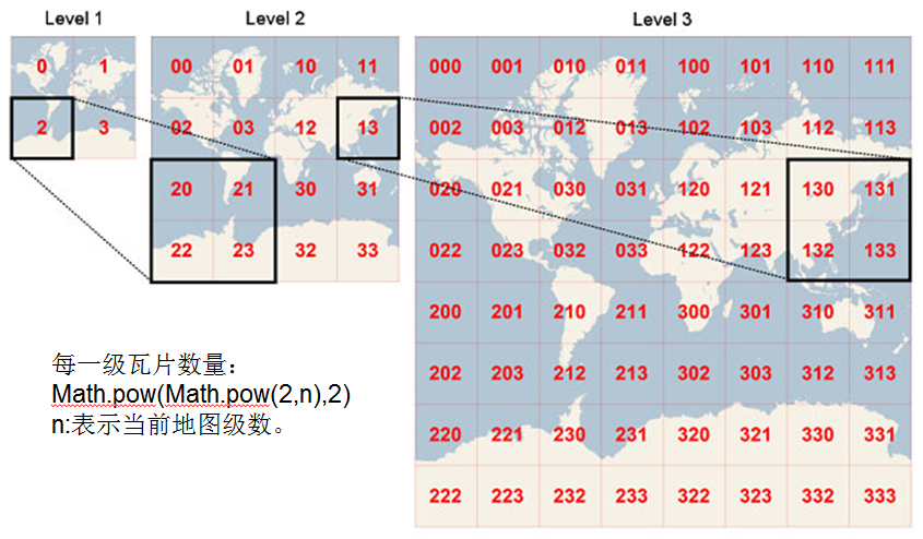 瓦片地图金字塔模型是一种多分辨率层次模型,从瓦片金字塔的底层到顶层,分辨率越来越低,但表示的地理范围不变(这张图瓦片坐标是从左上角开始,通常谷歌系标准的瓦片是从左下角起始的)。