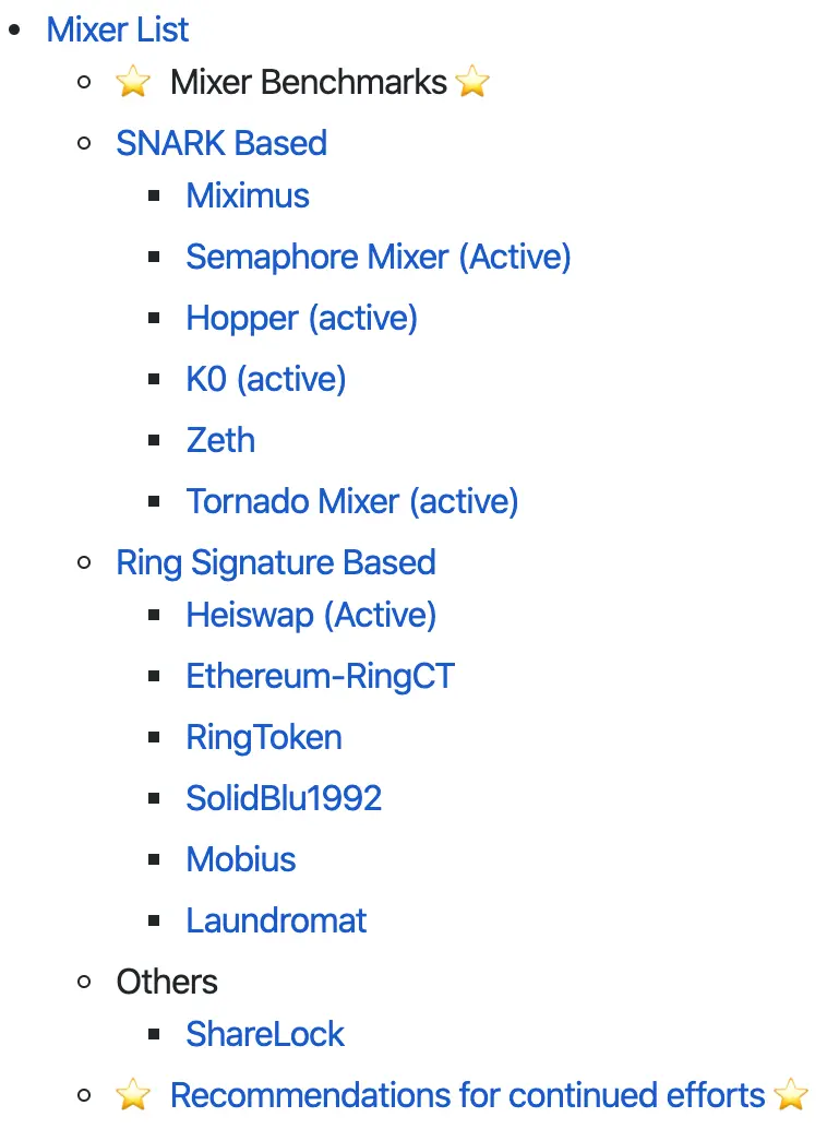 Mixer 项目其实还真不少,可认为有两大类的 Mixer,一种基于零知识证明技术(主要是 zk-SNARKs),另一种基于环签名技术(Ring Signature)。