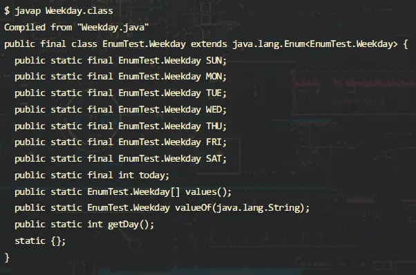 public final class EnumTest.Weekday extends java.lang.Enum<EnumTest.Weekday> {