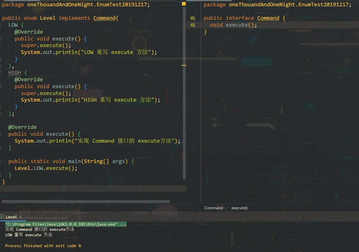 public和protected修饰符的构造方法,因此构造函数一定要是private或包级私有的。也正因为如此,所以枚举对象是无法在程序中通过直接调用其构造方法来初始化的。 - 定义 enum 类型时候,如果是简单类型,那么最后一个枚举值后不用跟任何一个符号;但如果有定制方法,那么最后一个枚举值与后面代码要用分号';'隔开,不能用逗号或空格。