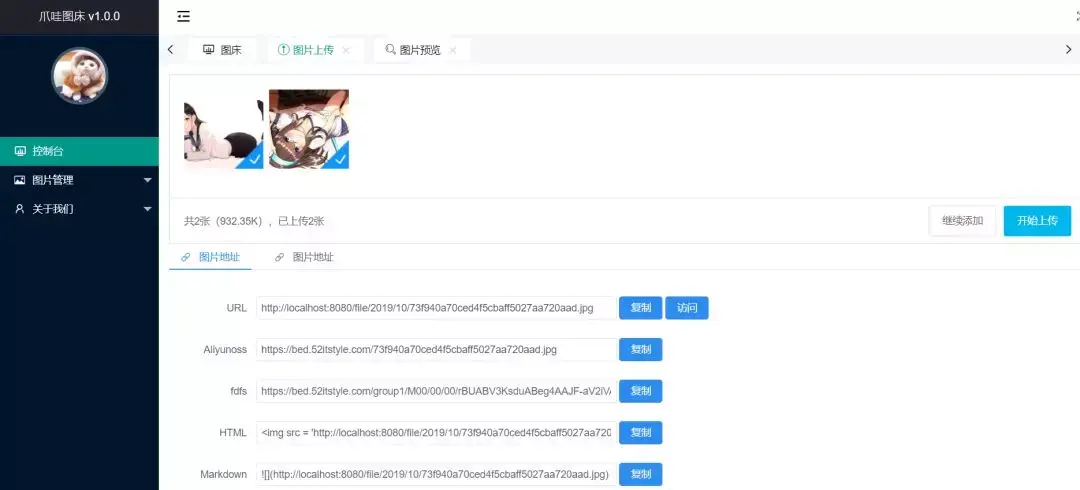 @Componentpublic class FastdfsUtils { public static final String DEFAULT_CHARSET = "UTF-8"; @Autowired private FastFileStorageClient fastFileStorageClient; /** * 上传 * @param file * @return * @throws IOException */ public StorePath upload(MultipartFile file) throws IOException { // 设置文件信息 Set<MetaData> mataData = new HashSet<>(); mataData.add(new MetaData("author", "fastdfs")); mataData.add(new MetaData("description",file.getOriginalFilename())); // 上传 StorePath storePath = fastFileStorageClient.uploadFile( file.getInputStream(), file.getSize(), FilenameUtils.getExtension(file.getOriginalFilename()), null); return storePath; } /** * 删除 * @param path */ public void delete(String path) { fastFileStorageClient.deleteFile(path); } /** * 删除 * @param group * @param path */ public void delete(String group,String path) { fastFileStorageClient.deleteFile(group,path); } /** * 文件下载 * @param path 文件路径,例如:/group1/path=M00/00/00/itstyle.png * @param filename 下载的文件命名 * @return */ public void download(String path, String filename, HttpServletResponse response) throws IOException { // 获取文件 StorePath storePath = StorePath.parseFromUrl(path); if (StringUtils.isBlank(filename)) { filename = FilenameUtils.getName(storePath.getPath()); } byte[] bytes = fastFileStorageClient.downloadFile(storePath.getGroup(), storePath.getPath(), new DownloadByteArray()); response.reset(); response.setContentType("applicatoin/octet-stream"); response.setHeader("Content-Disposition", "attachment;filename=" + URLEncoder.encode(filename, "UTF-8")); ServletOutputStream out = response.getOutputStream(); out.write(bytes); out.close(); }}图床预览