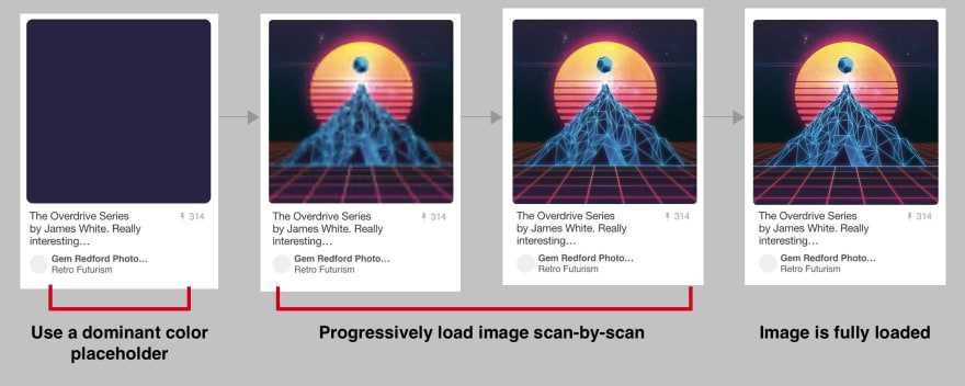 类似于先加载页面的骨架,渐进式图片这一技术让用户产生图片加载变快的印象。用户不再盯着一片空白区域等待事情发生,而能看到图像变得越来越清晰。