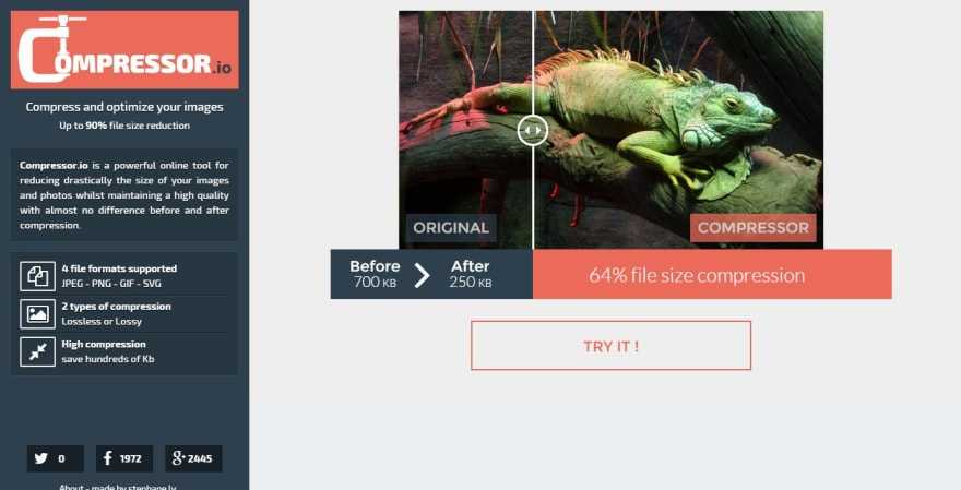 - Compressor.io,支持 JPG、PNG、SVG、GIF,每次上传 1 个文件
