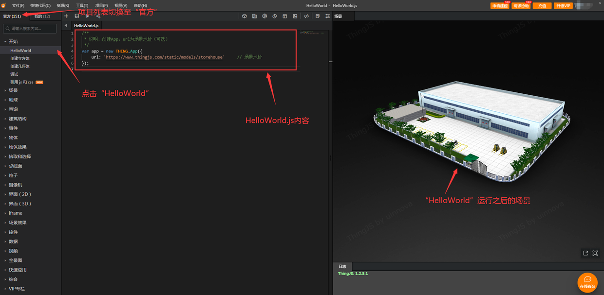 上述代码中 url: "models/storehouse" 指园区场景数据的地址,此处为选填,该地址可写绝对路径也可写相对路径。