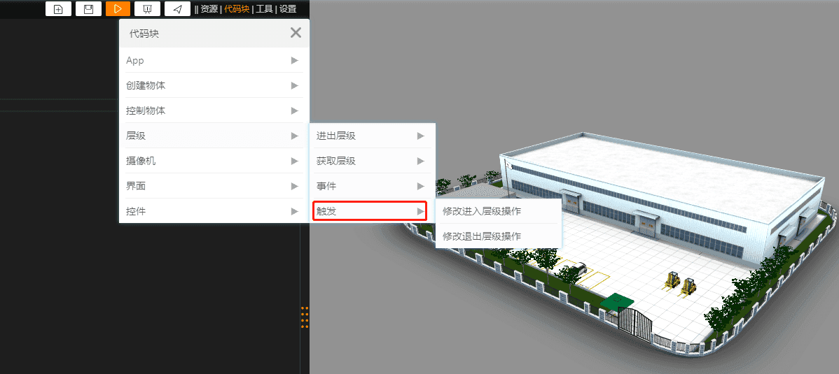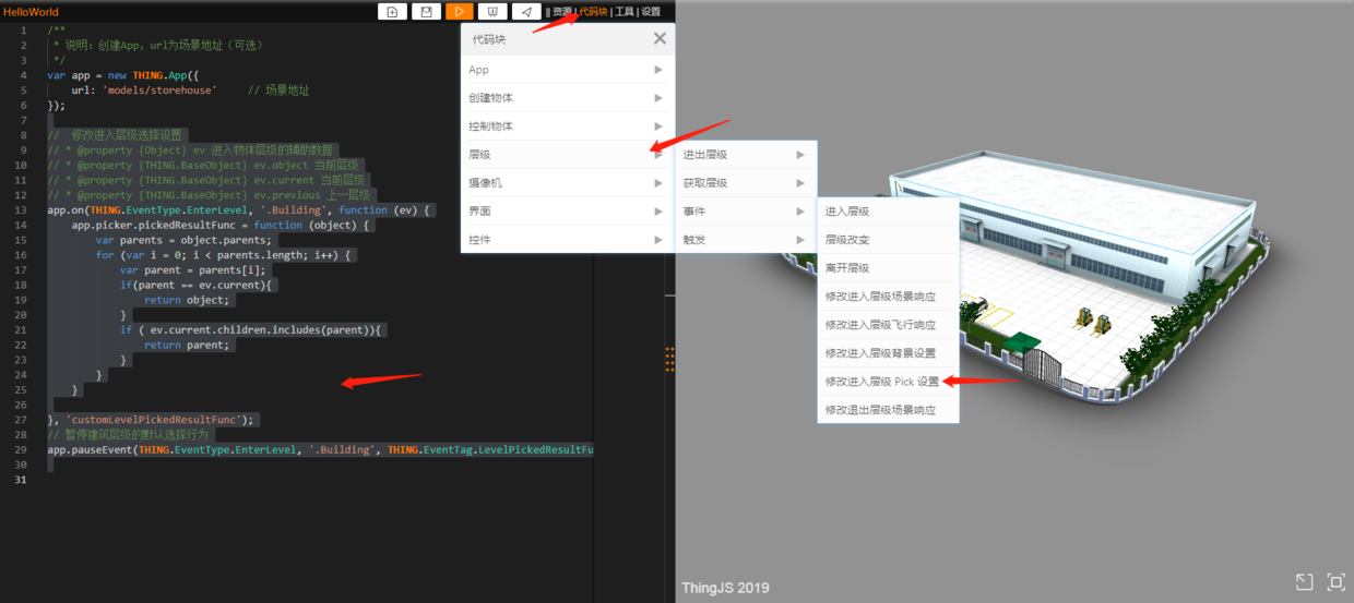 ThingJS 中设定左键双击可进入到所拾取的物体层级,右键单击可返回到上一层级。
