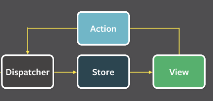 用户访问view -> 触发事件action -> Dispatcher知道后告知store要更新 -> store更新,触发视图View更新页面