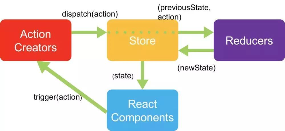Action Creator -> 触发action -> store.dispatch(action) -> reducer(state, action) -> 更新state