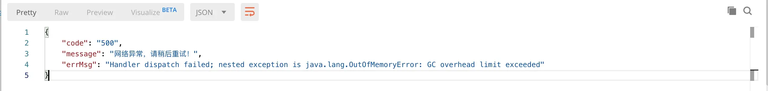 时间戳 [http-nio-端口号-exec-1] ERROR ResponseExceptionHandle:26 - Handler dispatch failed; nested exception is java.lang.OutOfMemoryError: GC overhead limit exceeded