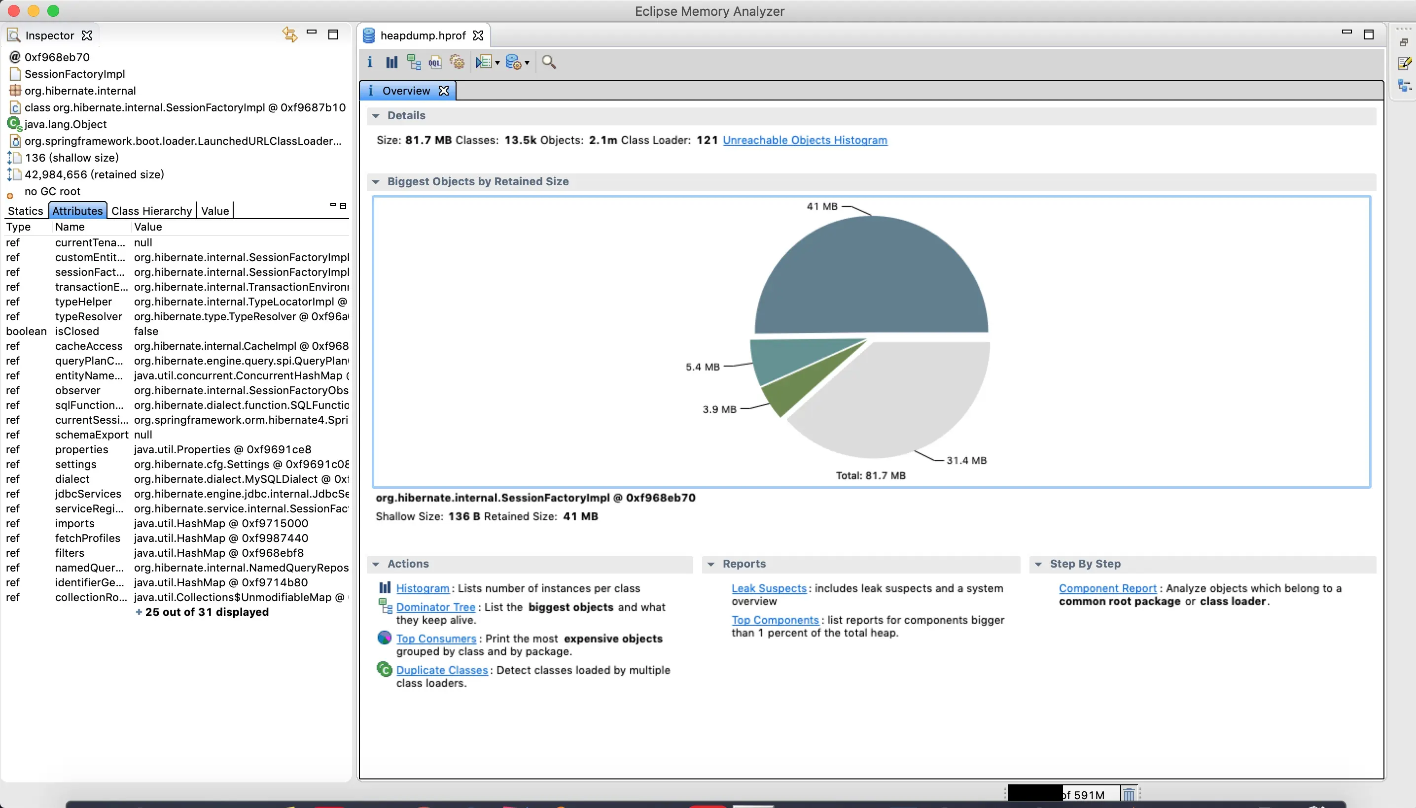 我们看到最大的那个区域就好(占用了41MB的):我们可以看到左下角是显示对象的名称:org.hibernate.internal.SessionFactoryImpl。我们的技术栈持久层框架使用的是hibernate(但是不怎么对底层了解😂)。