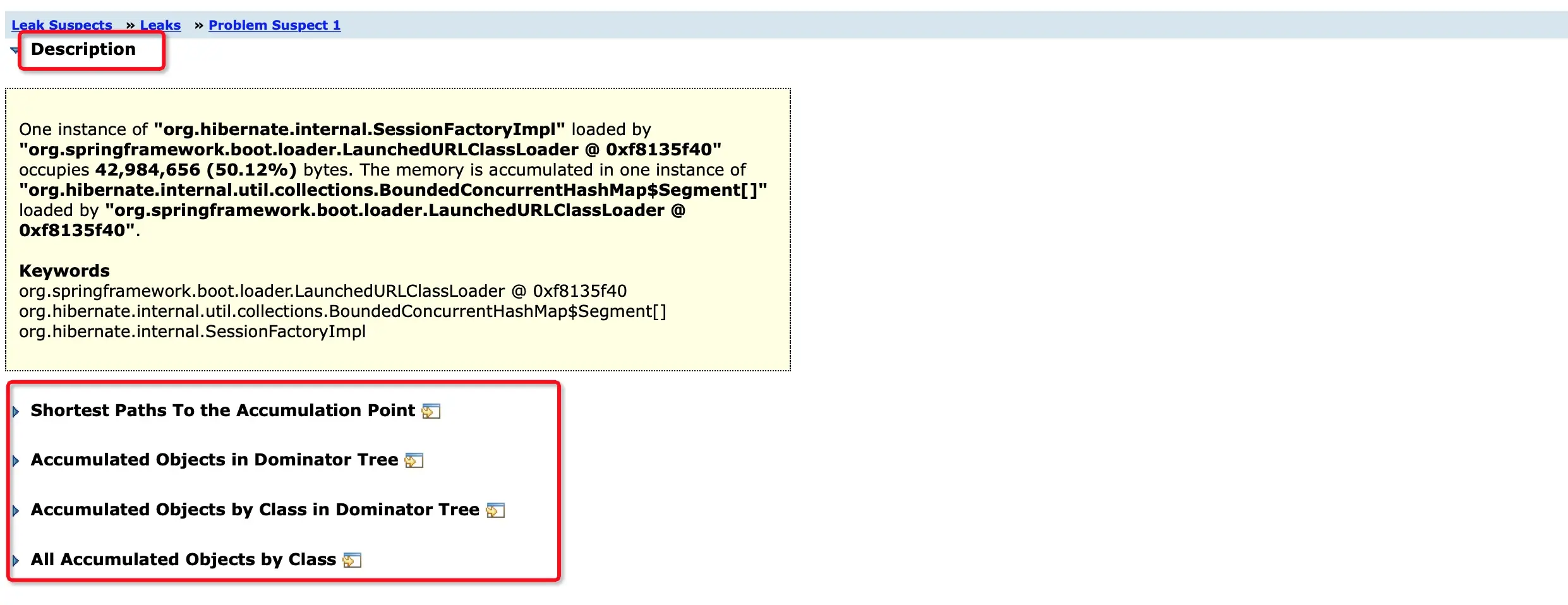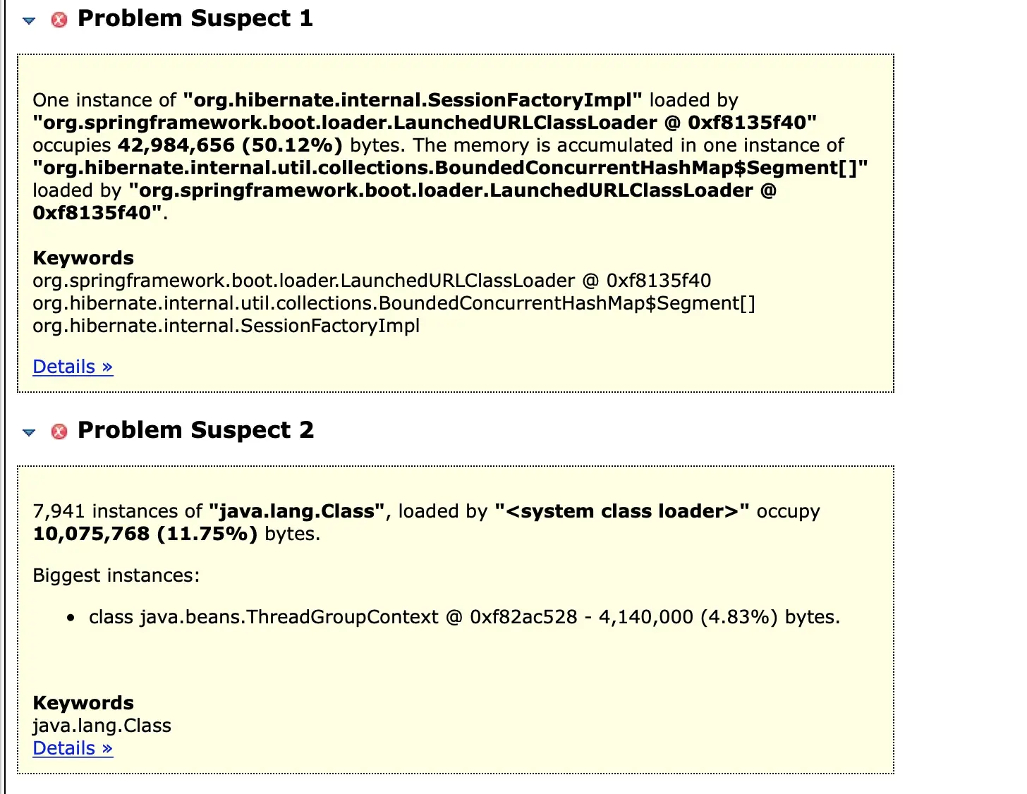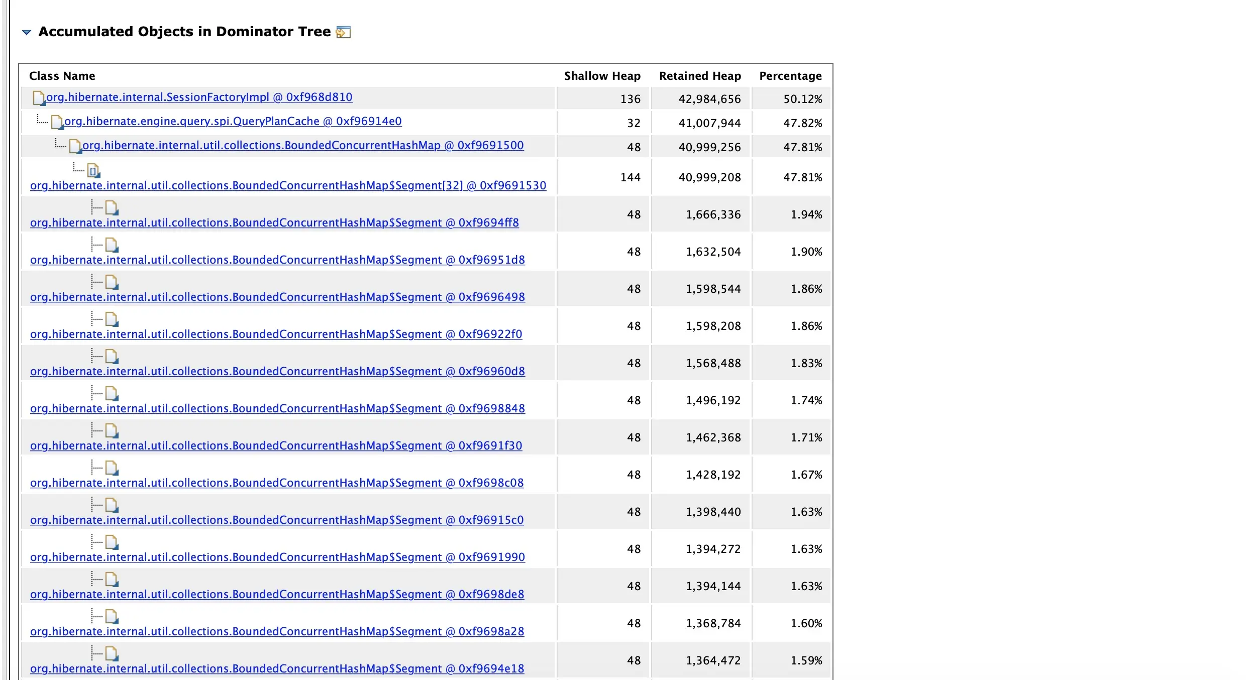 Question1:被LaunchedURLClassLoader类加载器加载的一个SessionFactoryImpl实例中的BoundedConcurrentHashMap堆积着内存空间,占据了42,984,656字节。