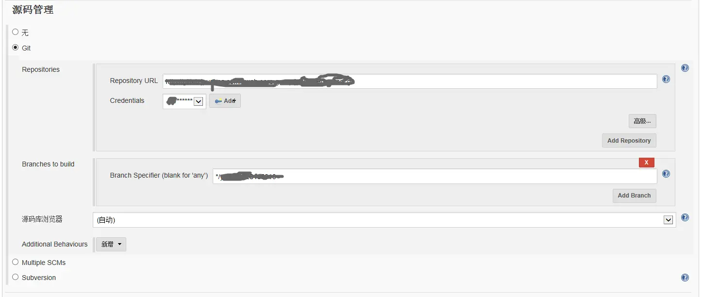 · 源码管理,根据项目情况选择;我们选择GIT中,填写对应的信息;