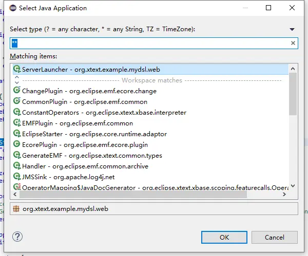 step3 右击包org.xtext.example.mydsl.web run as $\rightarrow$1 Java Application,弹出如下窗口,选择第一个选项ServerLancher org.xtext.eaxmple.mydsl.web