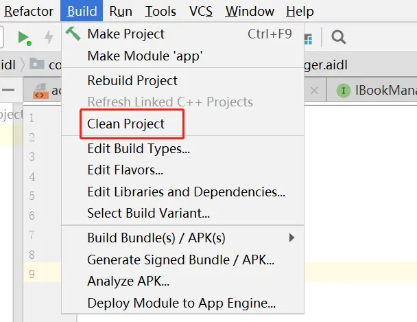 } 完成上述操作后,通过点击clean Project,再点击Rebuild Project即可自动生成IBookManager.java 文件(Android Studio版本不同,可能步骤不一样)