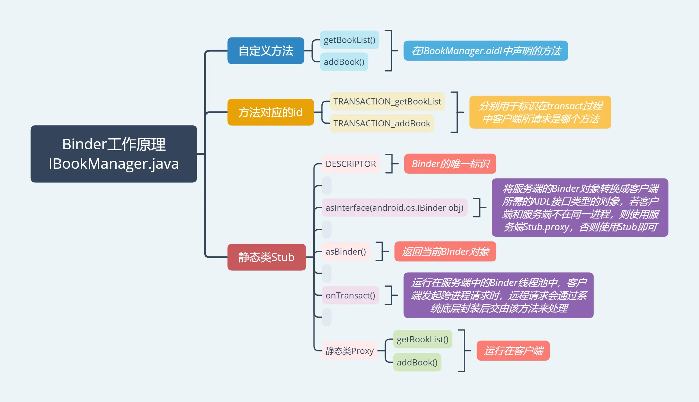 手动实现的Binder机制,没有写Stub类,而是将Stub类单独分离出来,即上面的BookManagerImpl类。