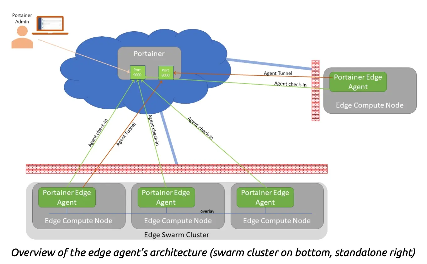 容器化部署是现在进行时,开源应用大多数支持容器化部署在少量机器的场景下往往采用docker cli 和 docker-compose管理,进行“单机式管理”机器稍多点会采用Docker Swarm群集的方式,毕竟k8s稍重如果有更多的机器情况下一般会采用k8s的方式在个人、创业公司、小团队的场景下我们往往在多个云、家里、vps上拥有少量虚拟机服务器,这些服务器上都运行了docker实例虽然我们也可以用公网vpn、zerotier等方式打通各个地域的机器形成一个内网,从而构建“群集”,但实际情况是没那么多带宽,从而无法“负载均衡”,所以实际的实际还是独立使用受限制于公网带宽很小,只能独立使用我们也拥有一些4G移动流量接入这种EDGE边缘场景的情况,这些IoT上也运行着Docker实例那么这些NAT内网环境下的Docker实例,公网IP环境下的Docker实例,是否能集中管理?当然可以,用Portainer就挺方便