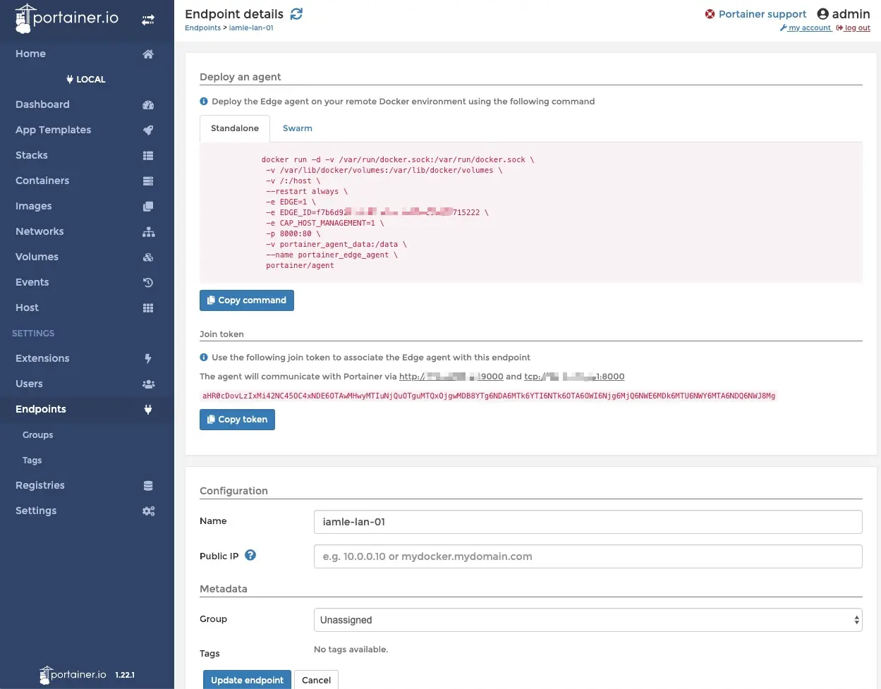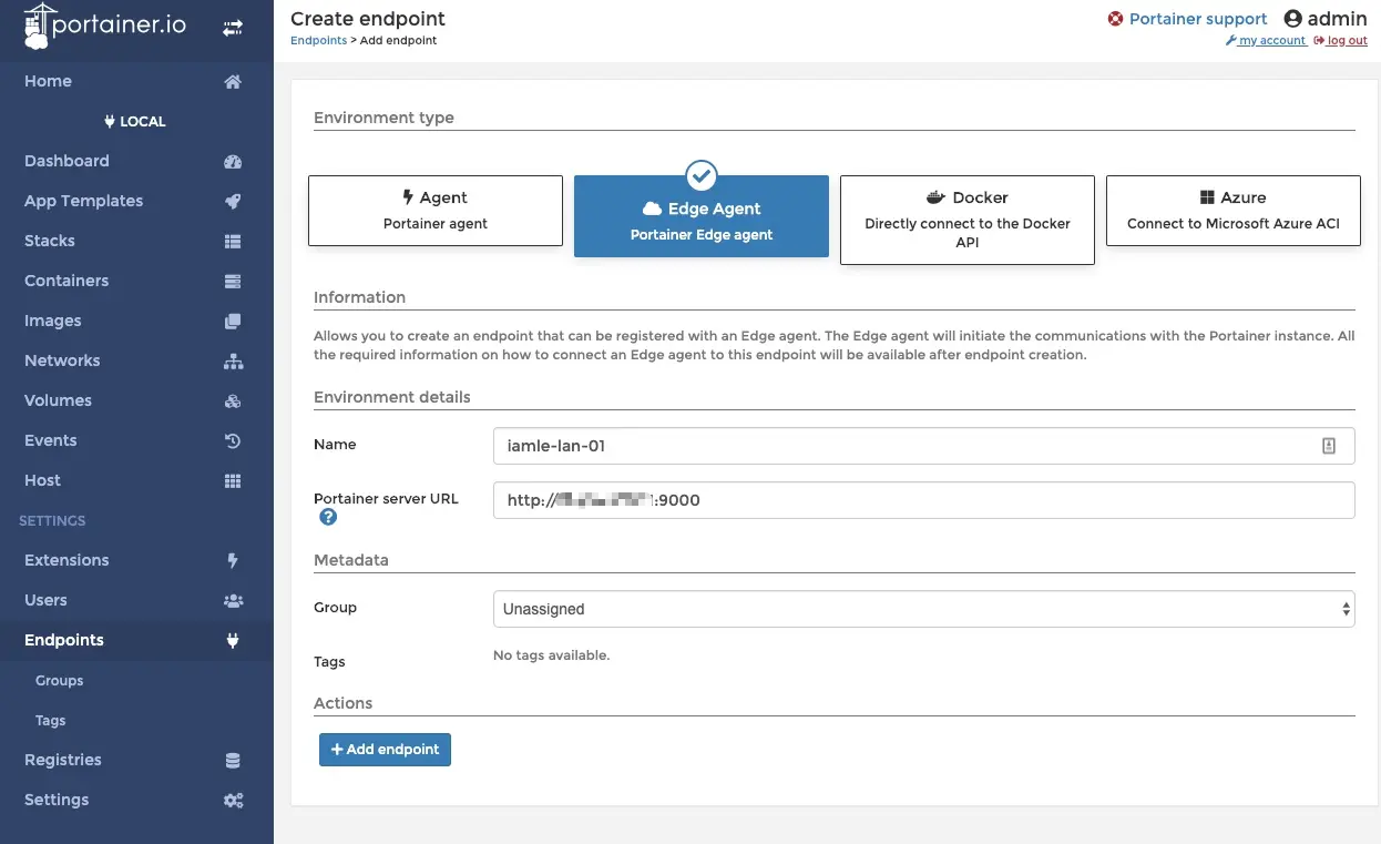 Portainer server上增加一个Edge AgentEndpoints菜单 》 Add endpoint 》 Edge Agent