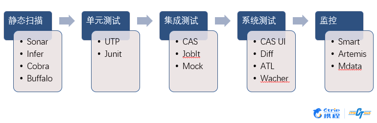 在实施DevOps过程中会涉及到很多的工具,我们把这些工具形象的称为工具链,而合理的整合工具链中的工具也是DevOps是否成功的关键因素之一。在测试各个阶段常用的测试手段通常包括静态代码扫描,单元测试,接口测试,UI自动化测试,流量回放等等。而这些测试手段在业界都有比较成熟的开源框架,比如SonarQube、Junit、Selenim、Appnium…. . 携程酒店测试根据自身情况,结合这些开源框架开发了一系列的平台和工具。
