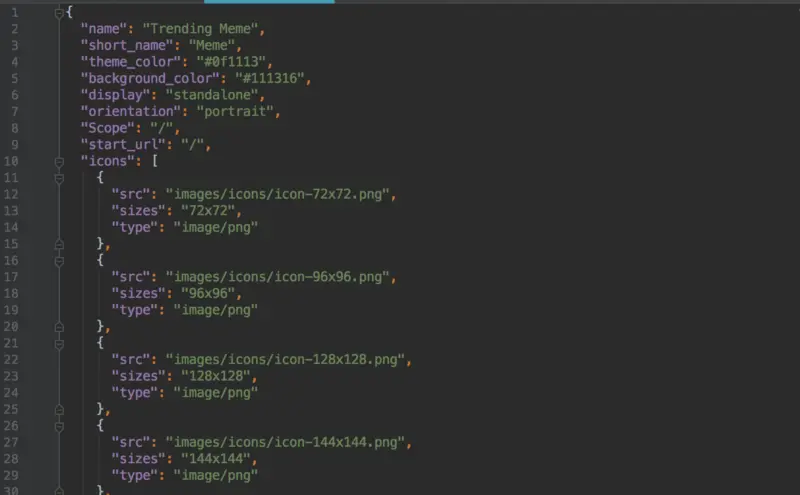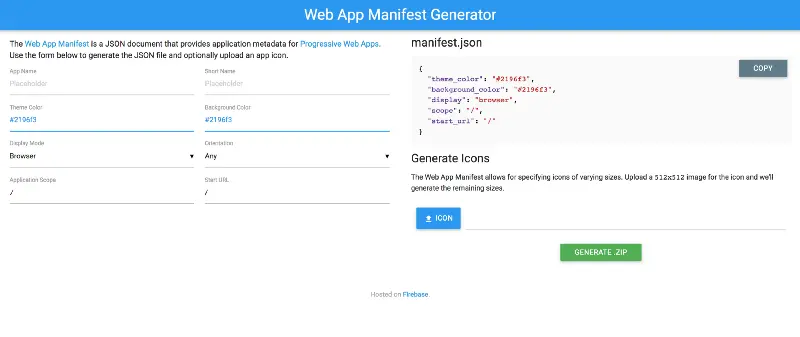 这只是一个提供Web应用相关的meta信息的json文件。它有诸如APP图标(用户在将其安装到设备中后会看到的图标),APP的背景颜色,APP的名称,简称等信息。我们可以自己编写manifest文件,也可以使用[工具][3]为我们生成一个manifest文件。