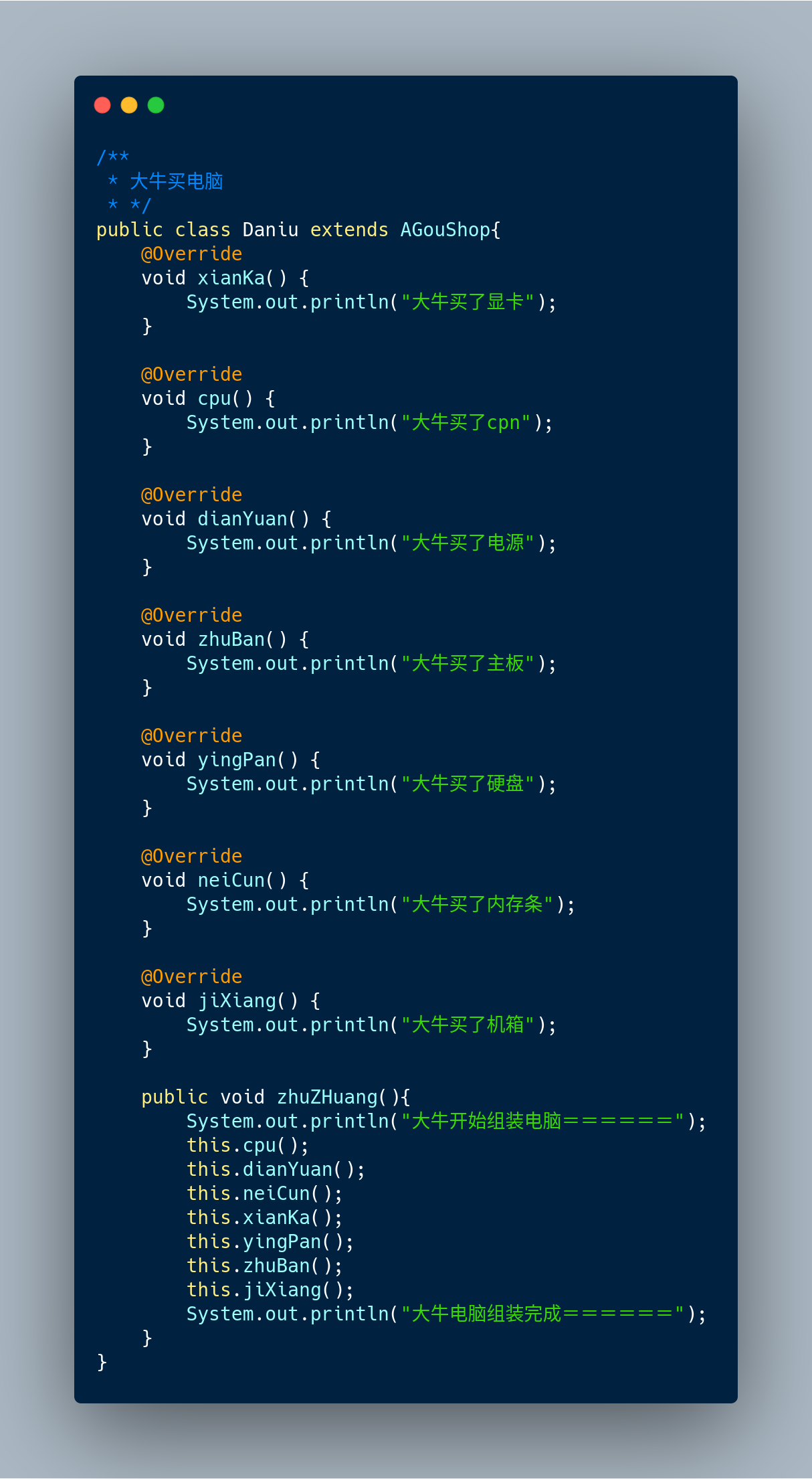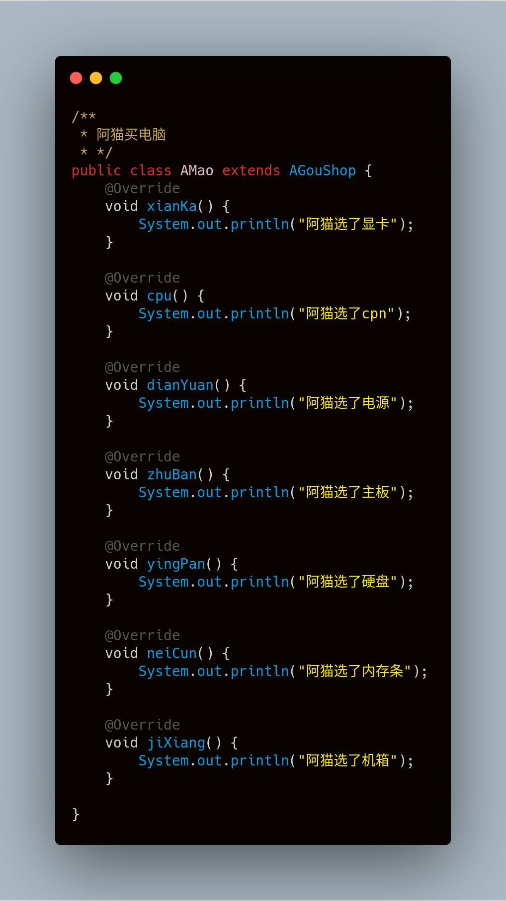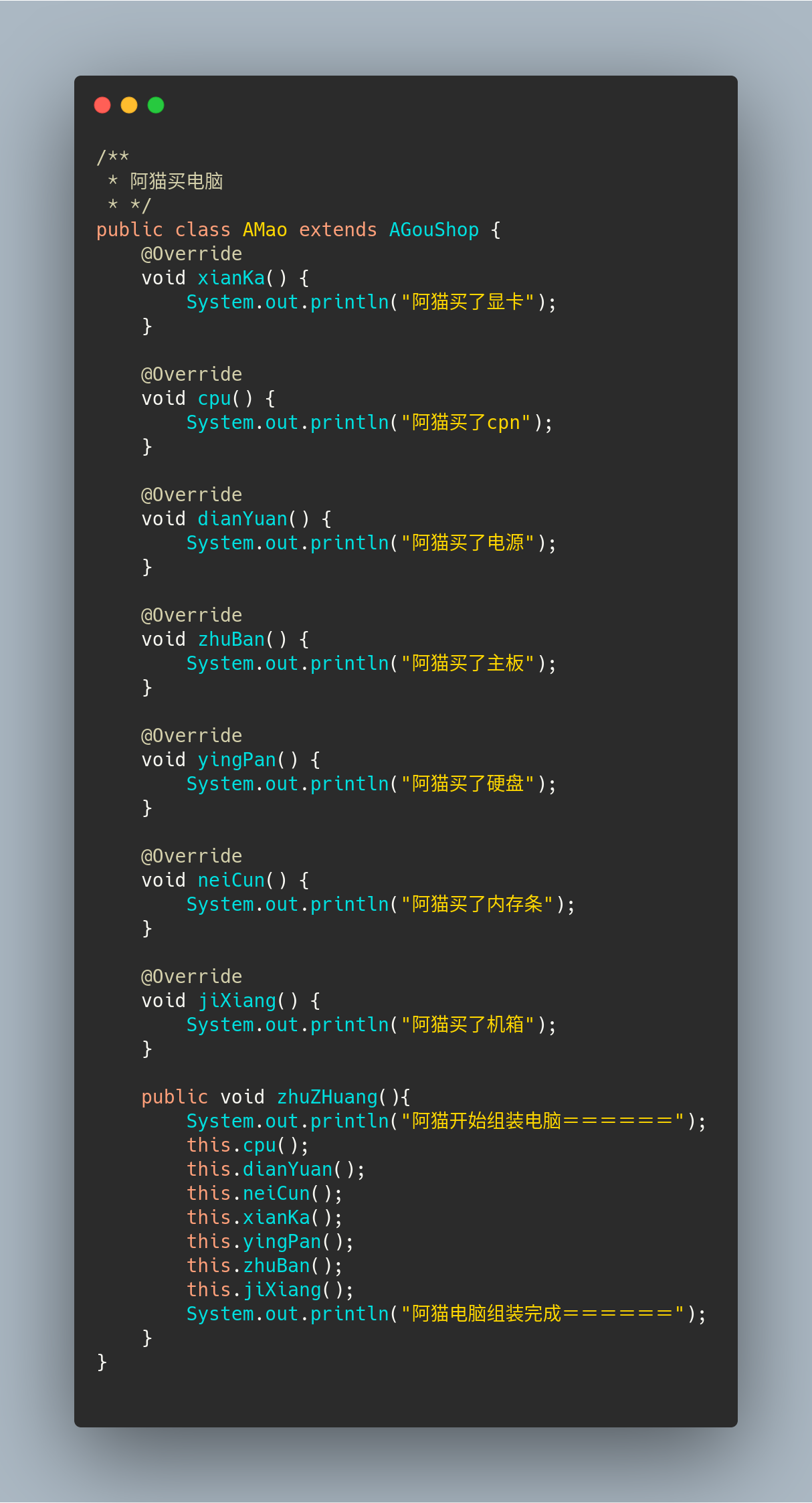 阿狗自从卖电脑后,发现头上的头发也慢慢的长了出来了,每天也更加自信了.一天,他发现客户有个痛点,就是买电脑要分别买好配件,然后再自己组装,有时候买的配件有问题,又要拿去换,导致费时费力.这时,阿狗头脑灵光一闪,想到了当年做程序员时的模板方法模式;何不把客户组装电脑的步骤自己承包,这样客户只要来买电脑时选下配件,我就帮他组装好给他.客户省心省力,到时候生意肯定好;于是他改造了他的电脑店: