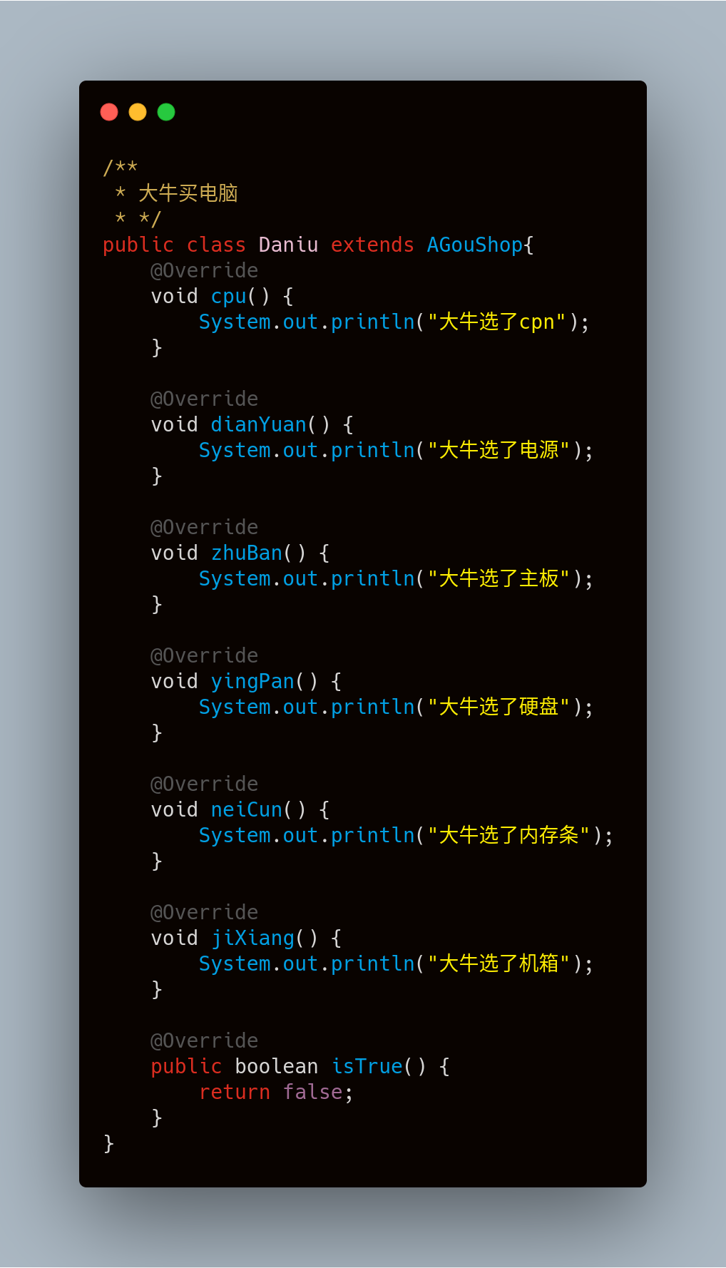 - 客户有选择显卡的权利:这里用到了模板方法模式中的钩子方法,通过客户暴露钩子方法,使其可以控制阿狗在装电脑是要不要装显卡这个步骤方法,钩子方法是模板方法模式的灵魂,有了它,这个模式才有更大的意义;