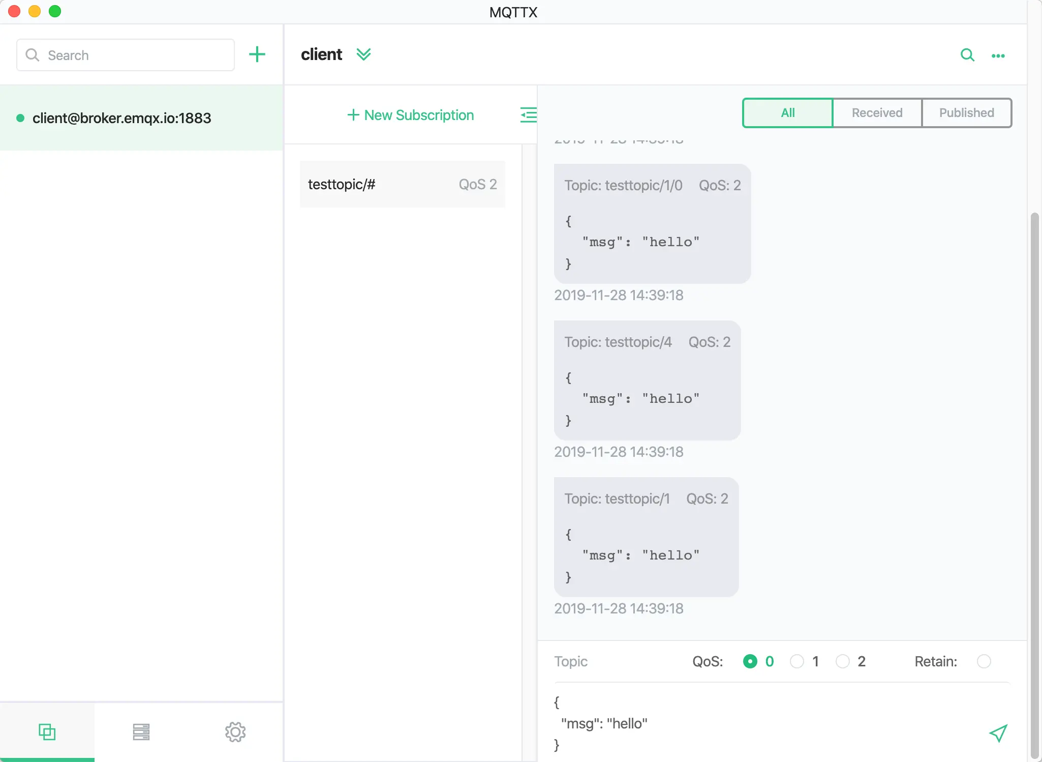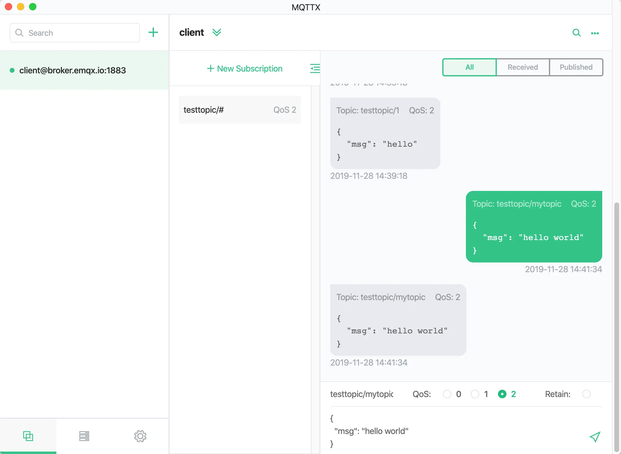 尝试使用 MQTTX 发布一条主题为 testtopic/mytopic ,内容为 {"msg": "hello world"} 的消息,由于之前已经订阅了 testtopic/# 这一主题,所以立即接收到了 Broker 转发回来的这条消息
