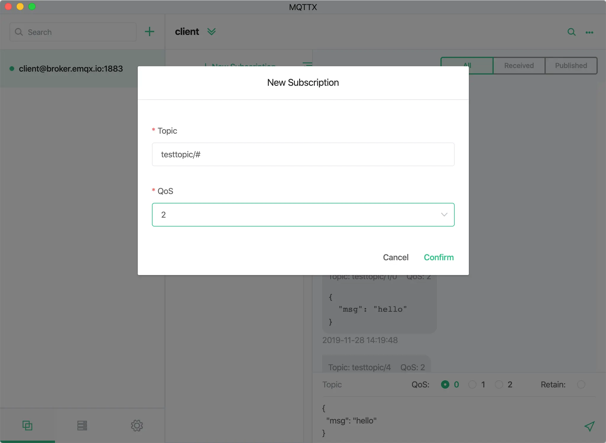 使用 MQTTX 连接 broker.emqx.io:1883 的 Broker 并创建主题为testtopic/# ,Qos 等于 2 的订阅。