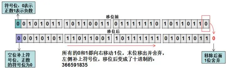 无符号右移运算符>>>的运算规则也很简单,丢弃右边指定位数,左边补上0。