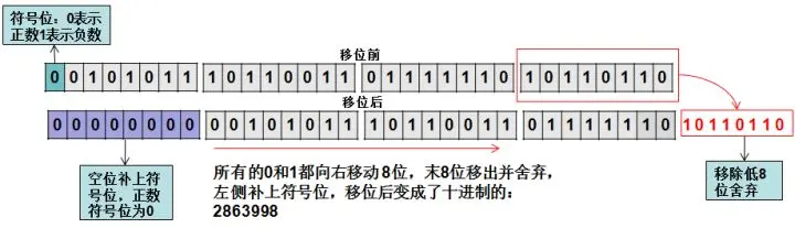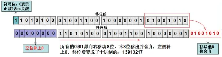 无符号右移运算符:>>> 无符号右移运算符>>>和右移运算符>>是一样的,只不过右移时左边是补上符号位,而无符号右移运算符是补上0,也就是说,对于正数移位来说等同于:>>,负数通过此移位运算符能移位成正数。以-733183670>>>8为例来画一下图