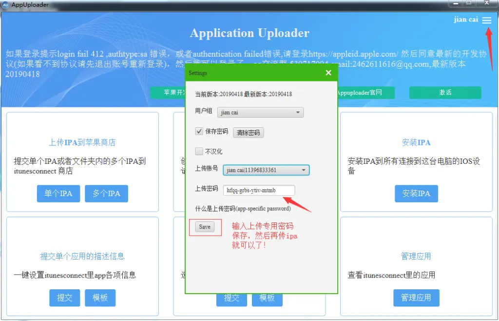 点击右上角,选择设置,把上传专用密码复制上去,同时勾选上保存密码,点击Save保存,然后再回去提交ipa上传就可以正常上传了。