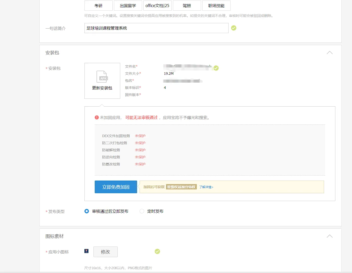 5、上传加固安装包 (1)安装包等级处理 上传到应用宝、华为应用平台时出现错误:“装包的API等级(targetSdkVersion)必须等于或高于26,请重新打包上传”,加入以下字段即可。